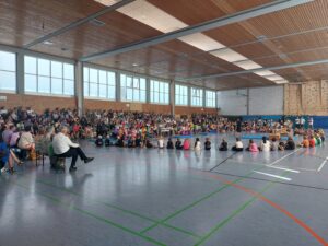 Am Dienstag, den 12.09.2023, durften wir die neuen ersten Klassen in unserer Schulgemeinschaft begrüßen. Der Einschulungstag startete mit einem Gottesdienst in der Osterfeldkirche. Um 14 Uhr begrüßte unsere Schulleiterin Frau Fischer-Heinrich die neuen Kinder, Eltern und Verwandten mit einem tollen Programm in der Sporthalle. Die zweiten und vierten Klassen zeigten mit einem bunten Akrobatik Programm und verschiedenen Liedern, was man alles Neues in der Schule lernen kann.
