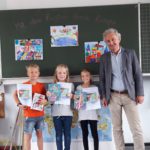 „Mit dem Flugtaxi durch Europa“, so lautete das Motto beim diesjährigen Europäischen Wettbewerb, an dem die Klasse 2b im Februar teilgenommen hat. Mit viel Eifer und interessanten Ideen gestalteten die Kinder ihre Bilder aus. Als glückliche Gewinner wurden Leon Haug, Sarah Bolz und Emma Fellmeth ausgewählt. Nach langem geduldigem Warten bekamen sie am Donnerstag, 11.Juli 2019, ihre Urkunden und Geschenke von Herrn Berroth, dem Leiter des Amts für Bildung, Erziehung und Betreuung überreicht, nachdem sie ihm zuvor ganz stolz ihre Bilder präsentieren durften. Herzlichen Glückwunsch den kleinen Künstlern!